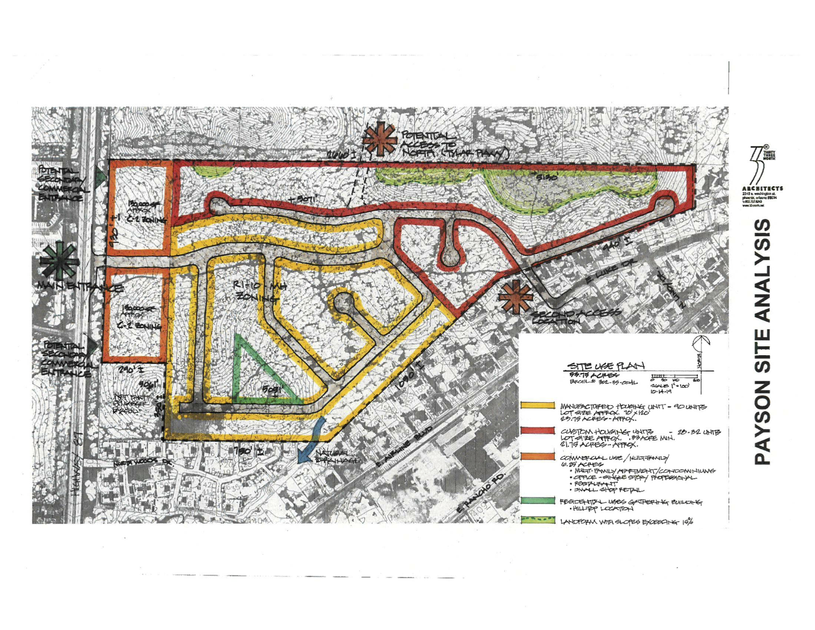The parcel number is 302-35-004L, the location is the east side of SR 87 south of Tyler Parkway. In this 53.75 acre parcel, approximately 6.25 acres have a C-2 Commercial Zoning, and 47.50 acres have R1-10 with a Mobile Home (MH) overlay. The proposed usage of the 6.25 acres along SR 87 with C-2 zoning will be used for commercial/multi-family development, and the 47.50 acres to have a combination of 90-100 lots for manufactured Housing and approximately 30 custom/semi-custom housing lots with a common community gathering building.